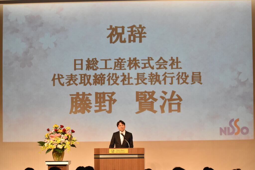 式典では代表取締役社長執行役員の藤野 賢治が登壇し、「少子高齢化の波はいよいよ大きくなっており、それに加えて製造現場の自動化は加速度的に進み、人に求められる仕事の領域も変化し続けている。そのような中だからこそ、お客様から求められる当社への期待は大きく、それに応えられる技術を身につける必要がある。当社は人的資本経営の実践に重きを置き、人材育成、教育に力を注いでいる。これから共に学び、お客様の課題を解決できる企業として一緒に成長して行きましょう。期待しています。」とメッセージを送り、これからの日総グループを担っていく新入社員を激励しました。